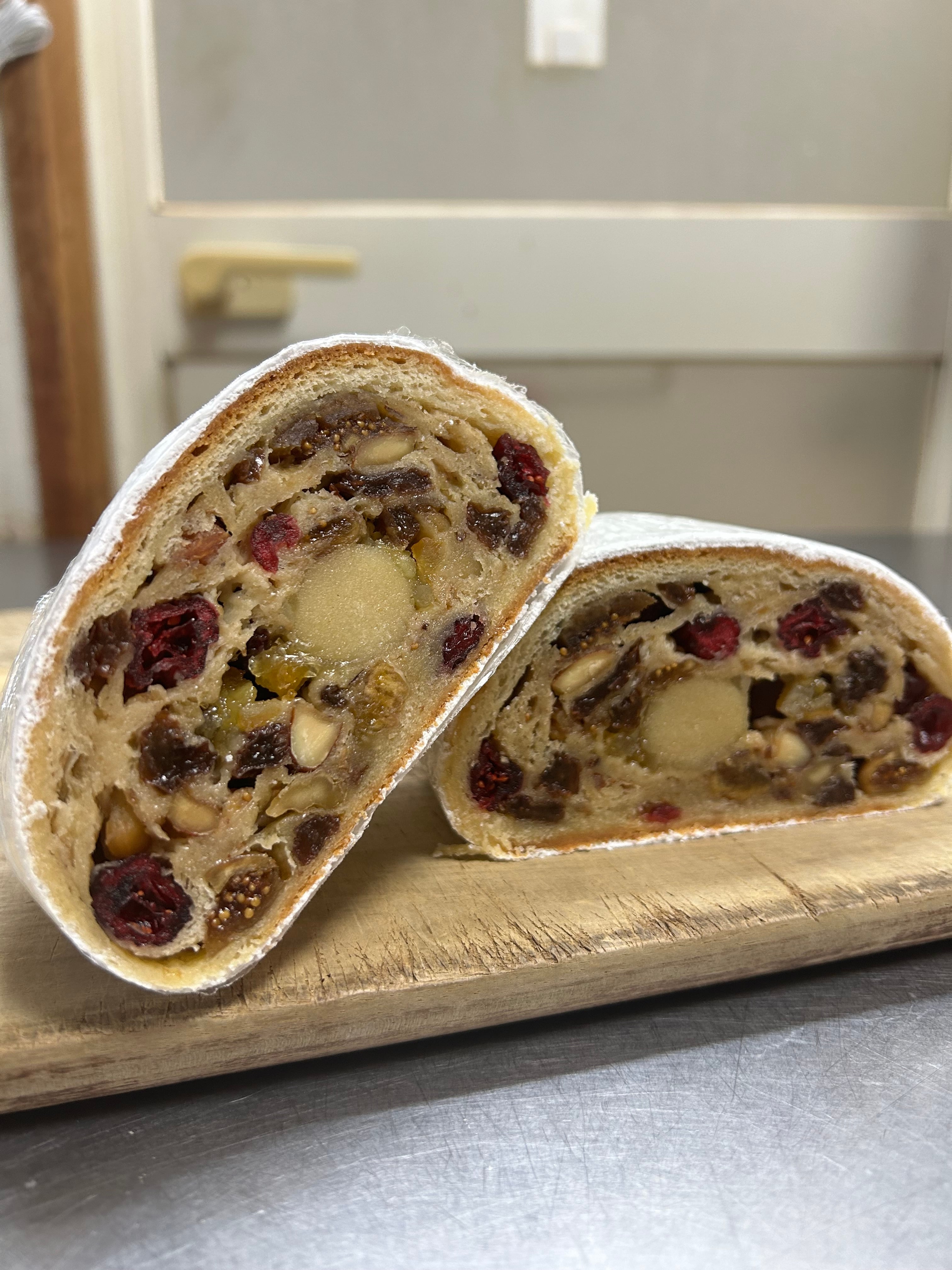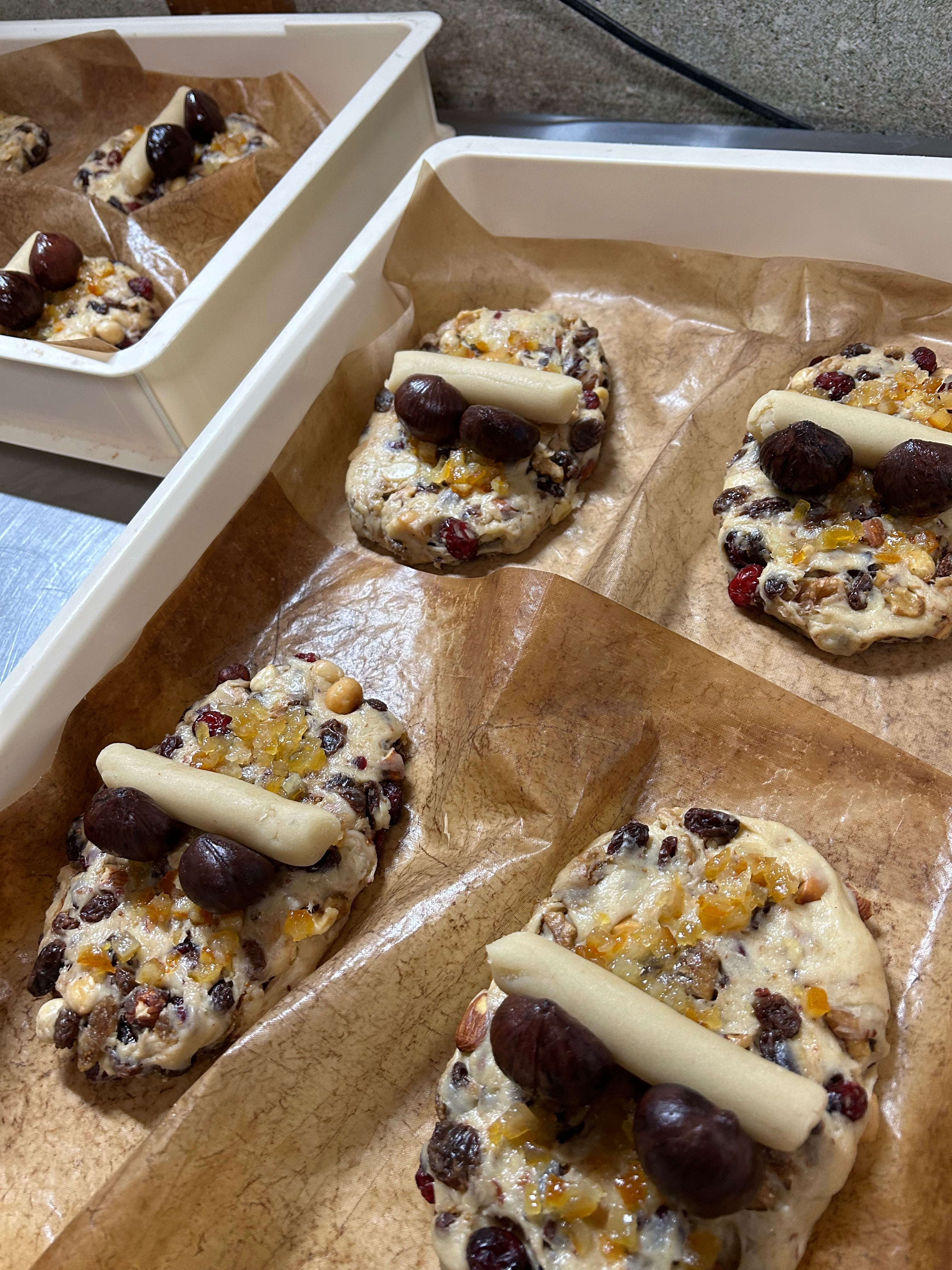 更に具材として、マジパン、渋皮栗、レモンピール、オレンジピールを巻き込み、焼成によりドライフルーツが焦げるのを防ぐ為に、皮生地で丁寧に包んで焼き上げます。